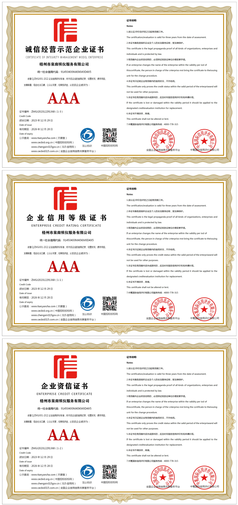 | 企业名称:梧州市泉南殡仪服务有限公司 | 统一社会信用代码:91450400MA5KM0D4X5 |