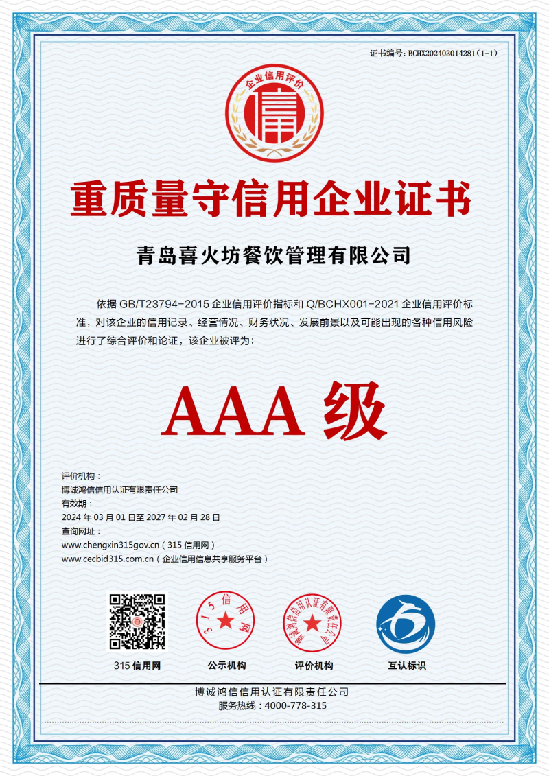 | 企业名称:青岛喜火坊餐饮管理有限公司 | 统一社会信用代码:91370211MAD2YUB69H |