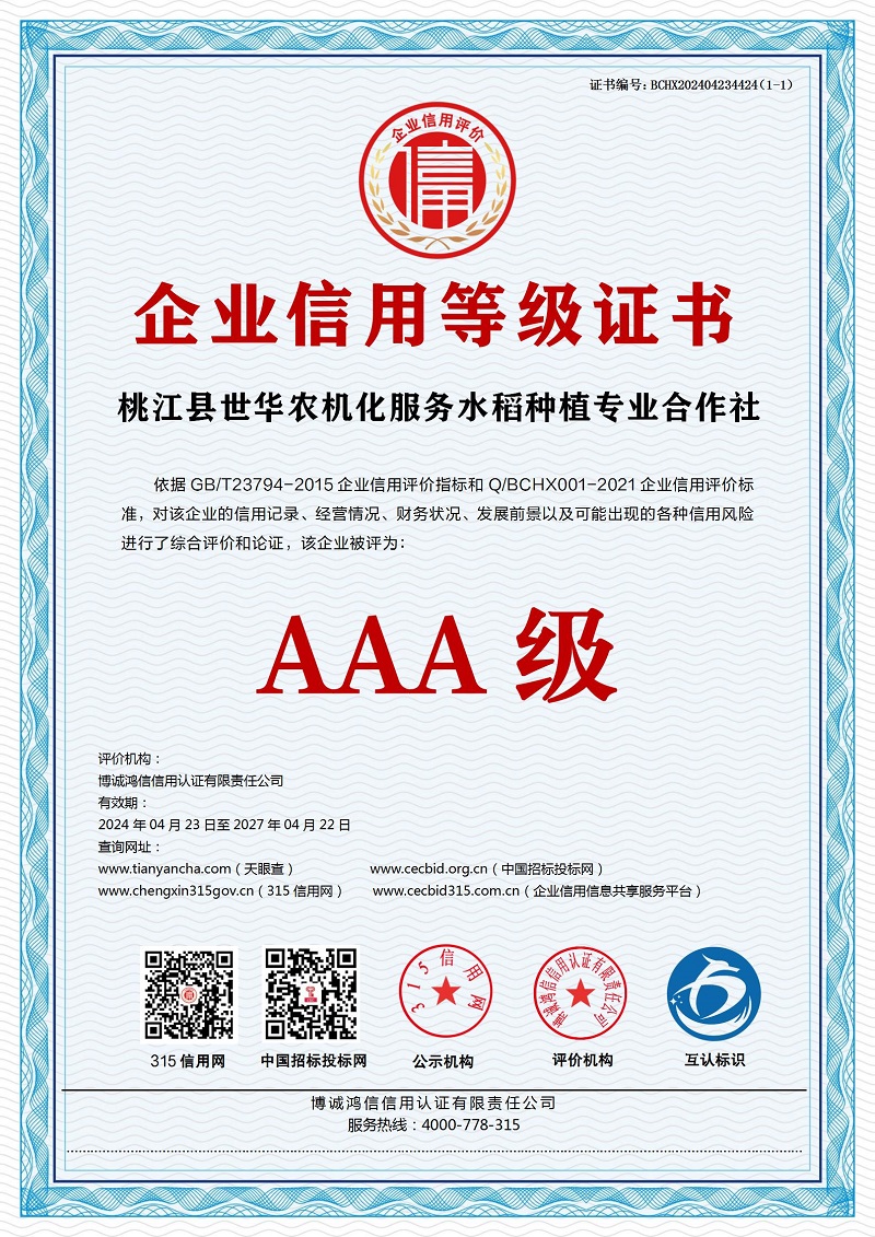 | 企业名称:桃江县世华农机化服务水稻种植专业合作社 | 统一社会信用代码:93430922MA4RGJHB6P |