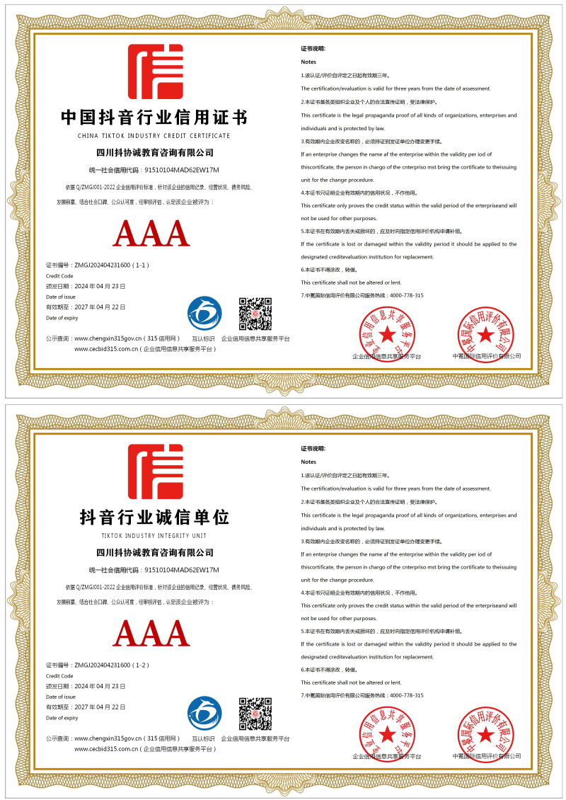 | 企业名称:四川抖协诚教育咨询有限公司 | 统一社会信用代码:91510104MAD62EW17M |