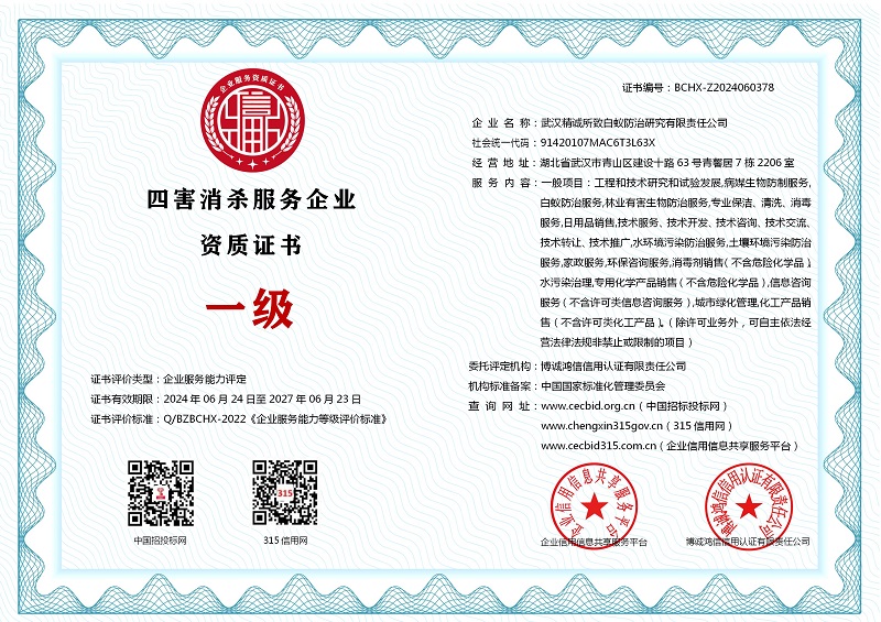 | 企业名称:武汉精诚所致白蚁防治研究有限责任公司 | 统一社会信用代码:91420107MAC6T3L63X |