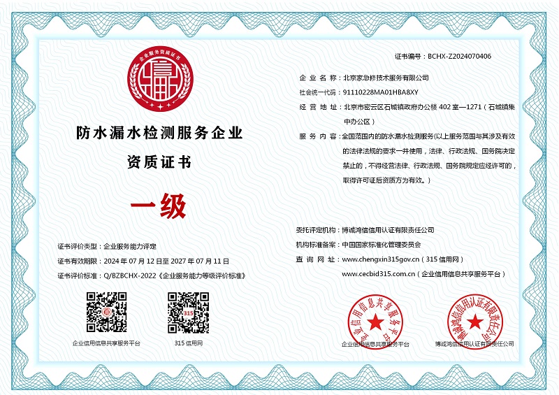 经营范围:全国范围内的防水漏水检测服务(以上服务范围与其涉及有效的法律法规的要求一并使用,法律、行政法规、国务院决定禁止的,不得经营法律、行政法规、国务院规定应经许可的,取得许可证后资质方为有效。)