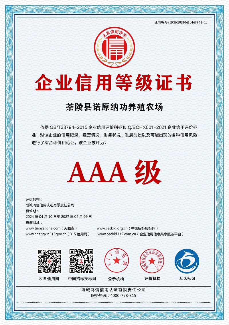 | 企业名称:茶陵县诺原纳功养殖农场 | 统一社会信用代码:91430224MA7L1W6D64 |