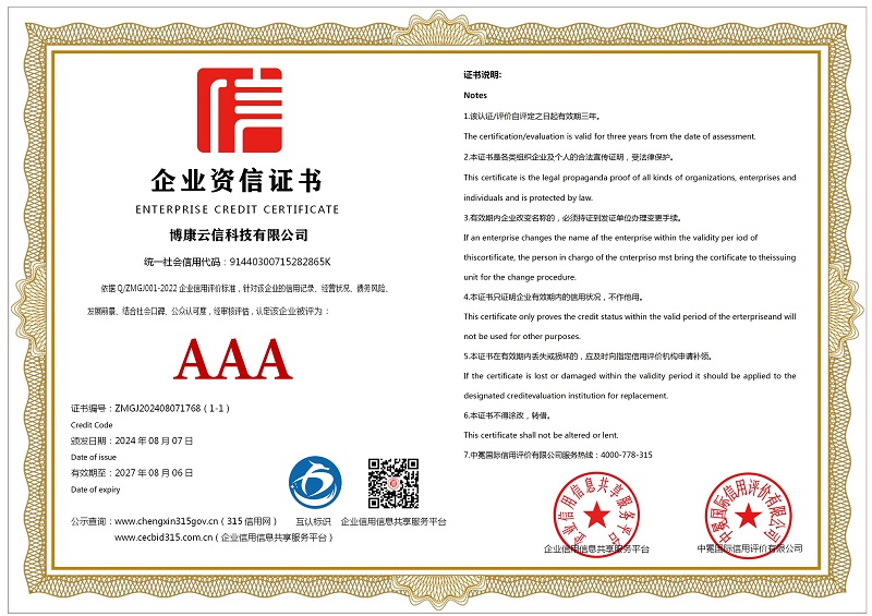 | 企业名称:博康云信科技有限公司 | 统一社会信用代码:91440300715282865K |