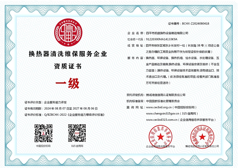 | 企业名称:四平市凯信换热设备制造有限公司 | 统一社会信用代码:91220300MA14133K9A |