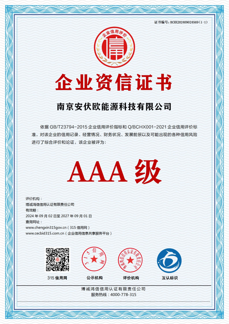 | 企业名称:南京安伏欧能源科技有限公司 | 统一社会信用代码:91320114MA25UP1N1H |