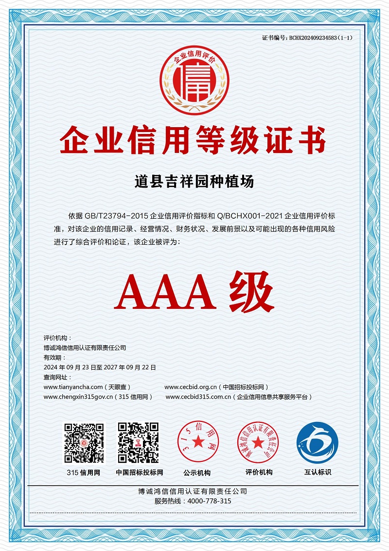 | 企业名称:道县吉祥园种植场 | 统一社会信用代码:91431124MABTTE0BX3 |