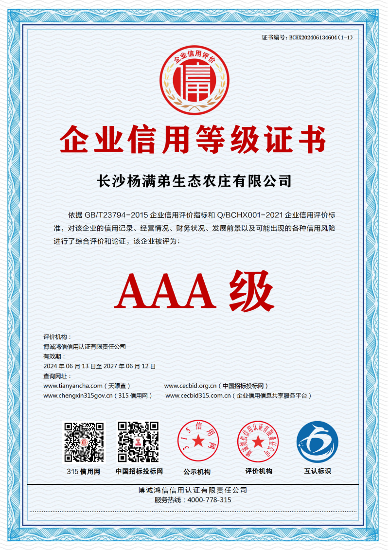 | 企业名称:长沙杨满弟生态农庄有限公司 | 统一社会信用代码:91430121MABWTGU33F |