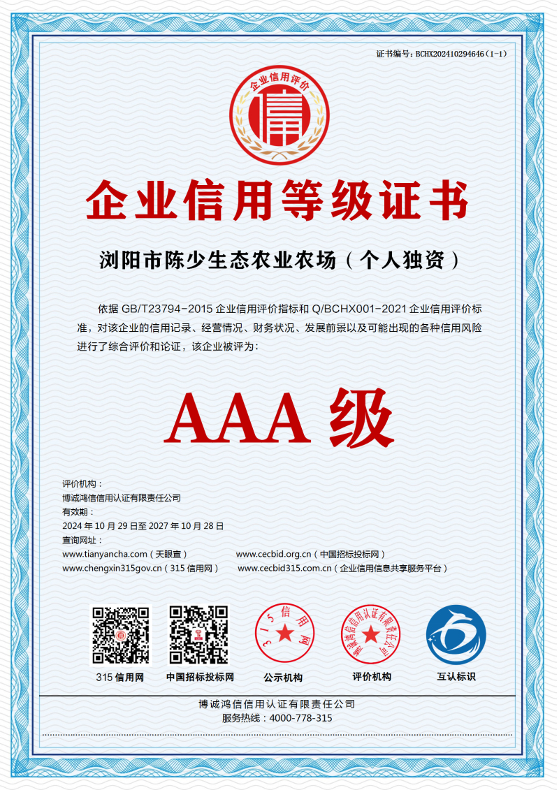 | 企业名称:浏阳市陈少生态农业农场(个人独资) | 统一社会信用代码:91430181MACHAFJD7N |