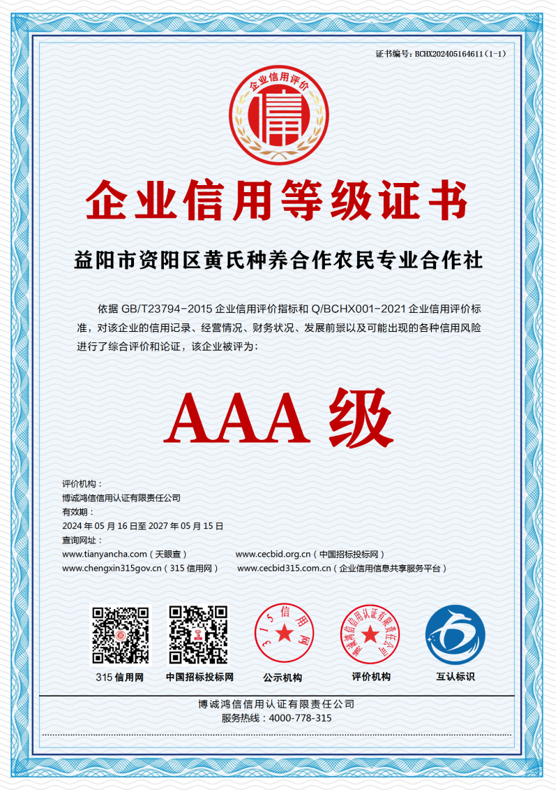 | 企业名称:益阳市资阳区黄氏种养合作农民专业合作社 | 统一社会信用代码:93430902MA7GYUJA40 |