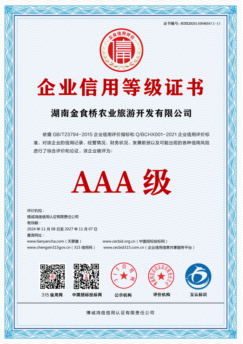 | 企业名称:湖南金食桥农业旅游开发有限公司 | 统一社会信用代码:91430524MAC743LJ42 |