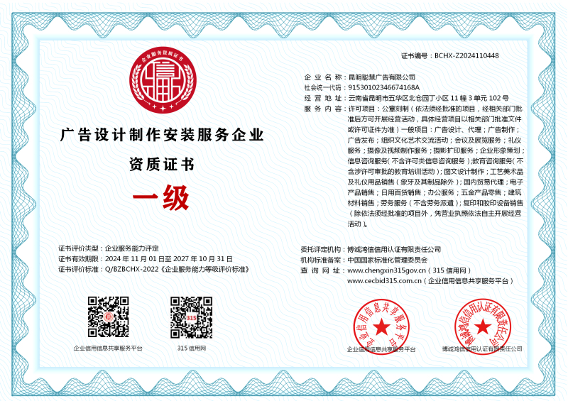 | 企业名称:昆明聪慧广告有限公司 | 统一社会信用代码:91530102346674168A |
