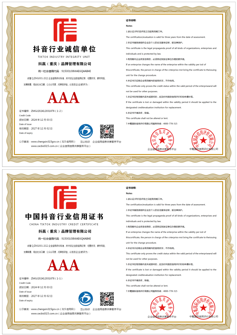 | 企业名称:抖赢(重庆)品牌管理有限公司 | 统一社会信用代码:91500108MAE6Q4AB4E |