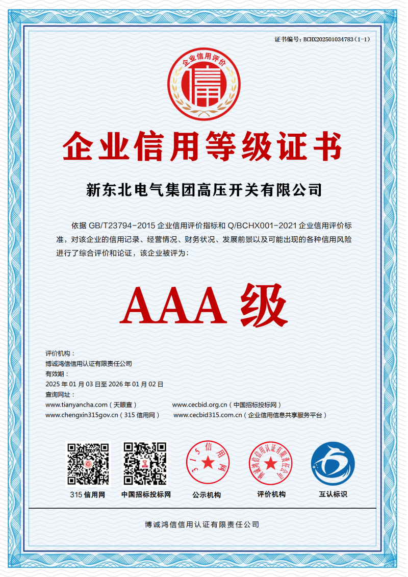 | 企业名称:新东北电气集团高压开关有限公司 | 统一社会信用代码:91210106784555310K |