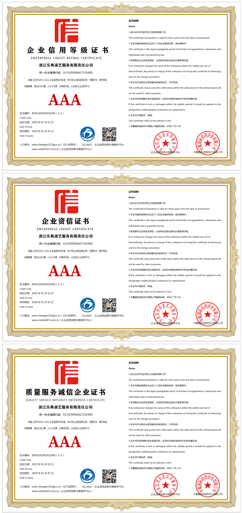 | 企业名称:浙江乐典演艺服务有限责任公司 | 统一社会信用代码:91330000MA27U0J44D |
