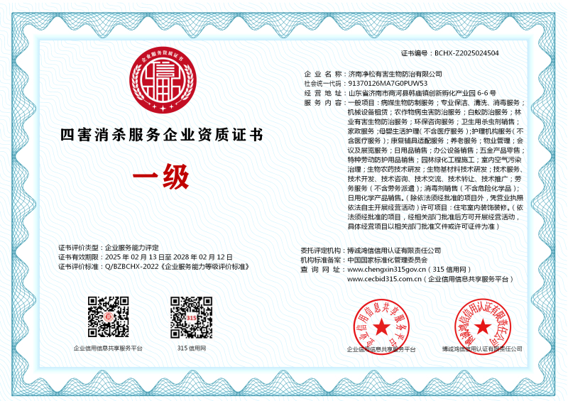 | 企业名称:济南净松有害生物防治有限公司 | 统一社会信用代码:91370126MA7G0PUW53 |