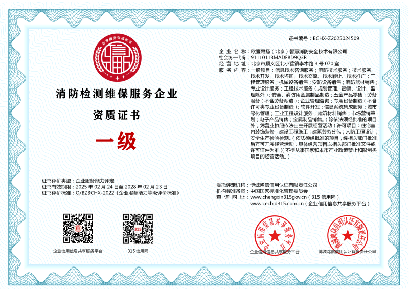 | 企业名称:欧壹昂扬(北京)智慧消防安全技术有限公司 | 统一社会信用代码:91110113MADF8D9Q3R |