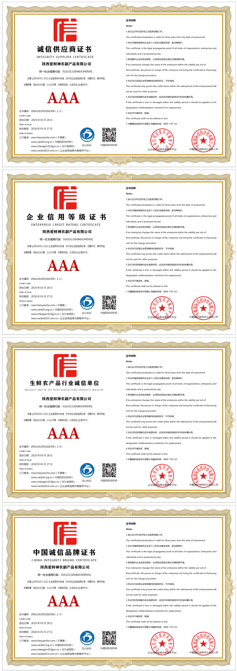 | 企业名称:陕西爱鲜神农副产品有限公司 | 统一社会信用代码:91610132MA6X3HEMXL |