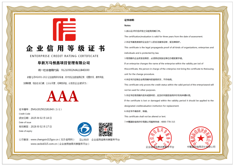| 企业名称:阜新万马恒鑫项目管理有限公司 | 统一社会信用代码:91210902MA11B4E690 |