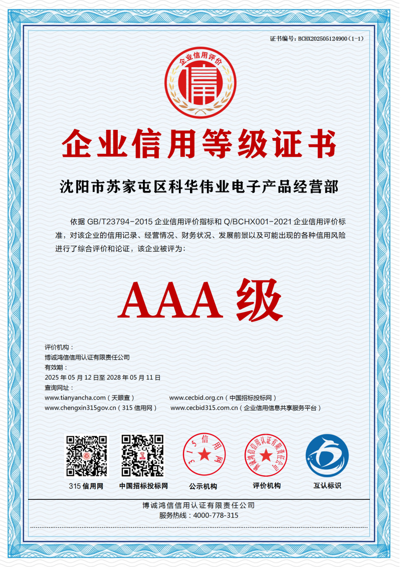 | 企业名称:沈阳市苏家屯区科华伟业电子产品经营部 | 统一社会信用代码:92210111MA0U92U69D |