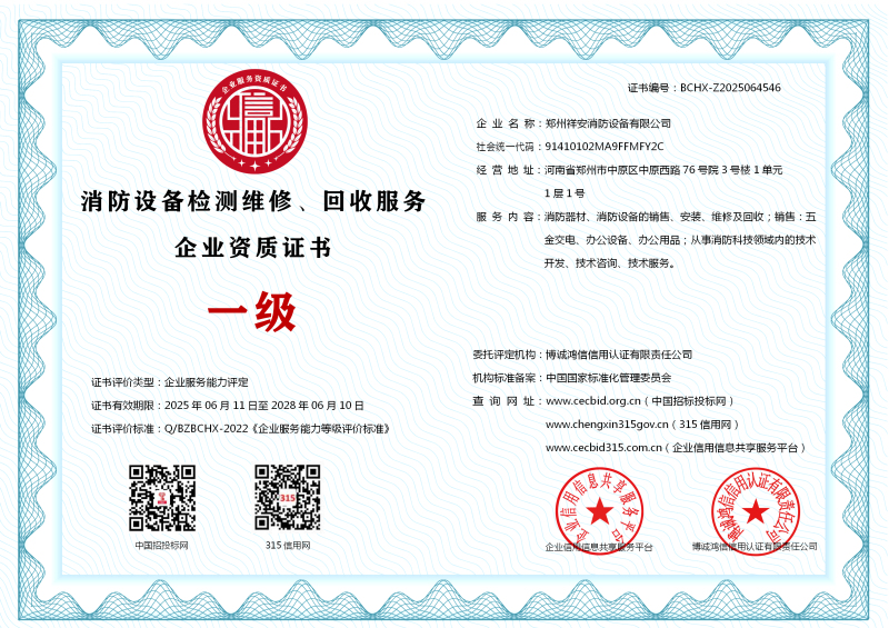 | 企业名称:郑州祥安消防设备有限公司 | 统一社会信用代码:91410102MA9FFMFY2C |