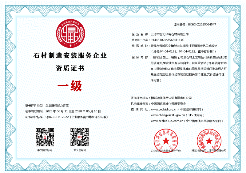 | 企业名称:云浮市世纪华粤石材有限公司 | 统一社会信用代码:91445302MA5680HB3X |