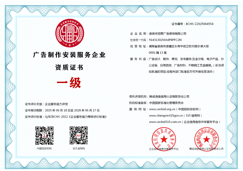 | 企业名称:娄底市百泰广告装饰有限公司 | 统一社会信用代码:91431302MA4P8PFC2N |