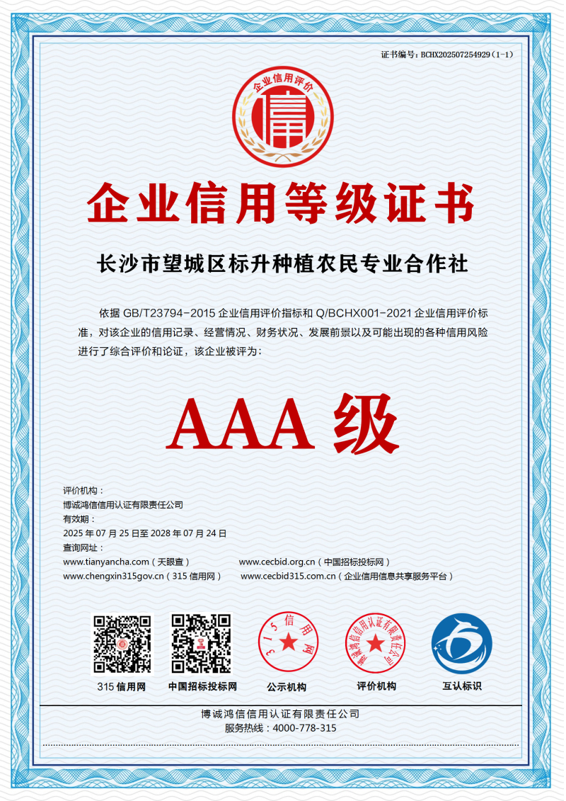 | 企业名称:长沙市望城区标升种植农民专业合作社 | 统一社会信用代码:93430112MAD9H9XN4D |