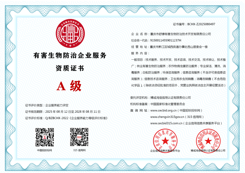 | 企业名称:重庆市舒康有害生物防治技术开发有限责任公司 | 统一社会信用代码:91500114559011237H |