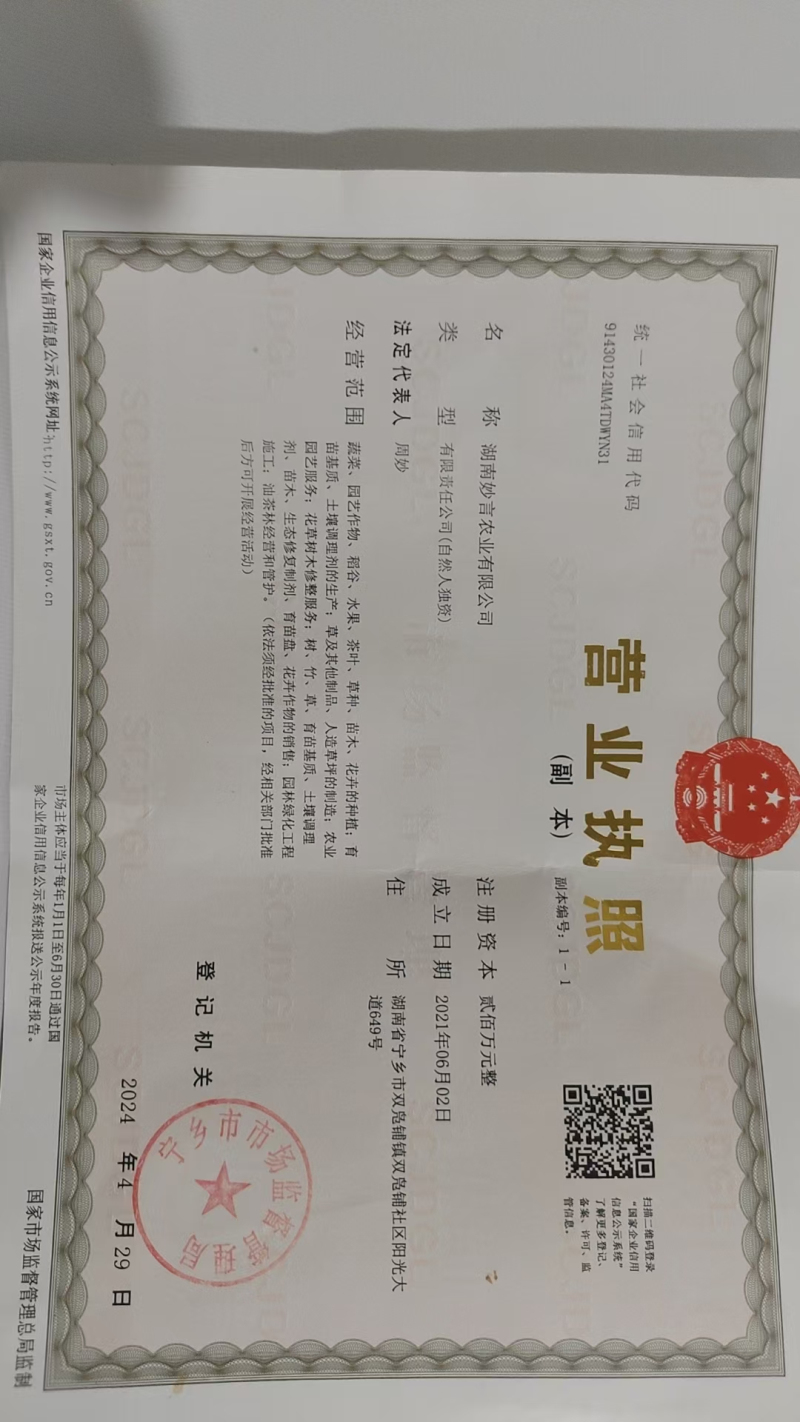 经营范围:蔬菜、园艺作物、稻谷、水果、茶叶、草种、苗木、花卉的种植;育苗基质、土壤调理剂的生产;草及其他制品、人造草坪的制造;农业园艺服务;花草树木修整服务;树、竹、草、育苗基质、土壤调理剂、苗木、生态修复制剂、育苗盘、花卉作物的销售;园林绿化工程施工;油茶林经营和管护。(依法须经批准的项目,经相关部门批准后方可开展经营活动)