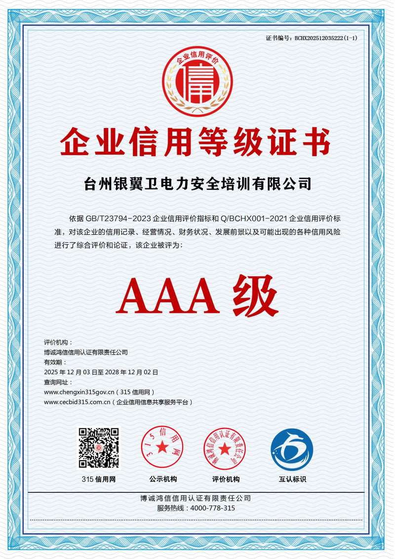 | 企业名称:台州银翼卫电力安全培训有限公司 | 统一社会信用代码:91331022MA7GXML16H |