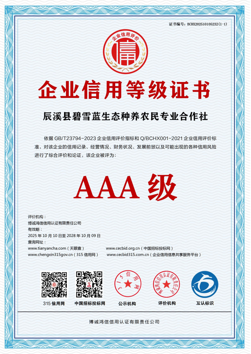 | 企业名称:辰溪县碧雪蓝生态种养农民专业合作社 | 统一社会信用代码:93431223MAE3EMUN0B |