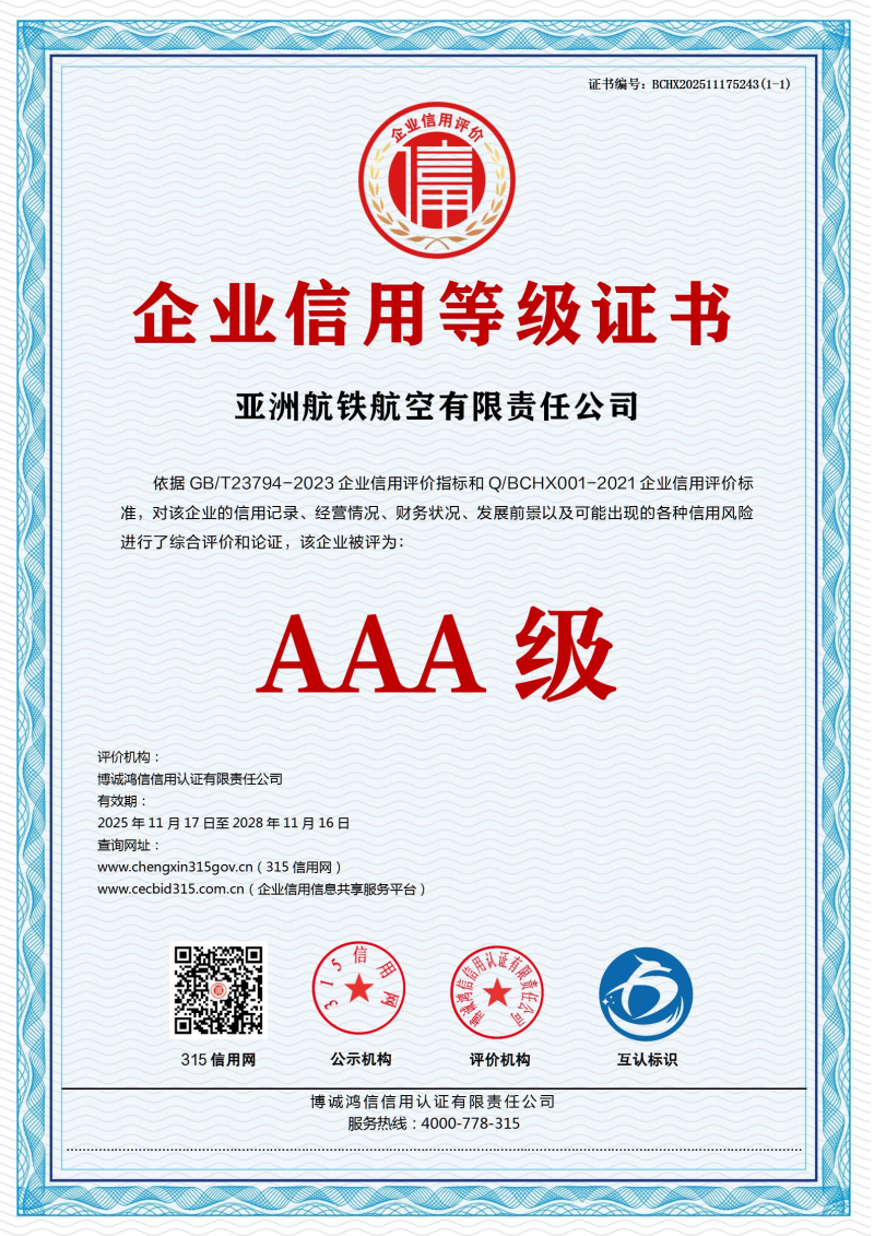 | 企业名称:亚洲航铁航空有限责任公司 | 统一社会信用代码:91370211MA3CLU579Y |